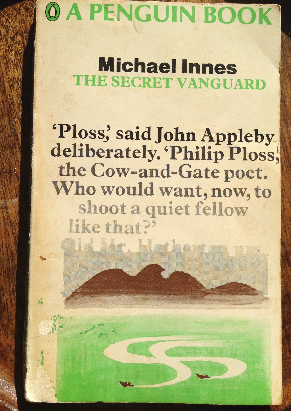 There are times when the brain shrinks and all one needs is the soothing assurance of a good friend - like, for instance, when one has a beastly cold and wants only to sit in the sun and read without being disturbed in body or in spirit. That's why I have been back at the shelves in my bedroom bookcase, the one with the neat shelves that will only hold old paperbacks (I've discussed such books before, yes?) The illustration is of my own copy of Michael Innes'